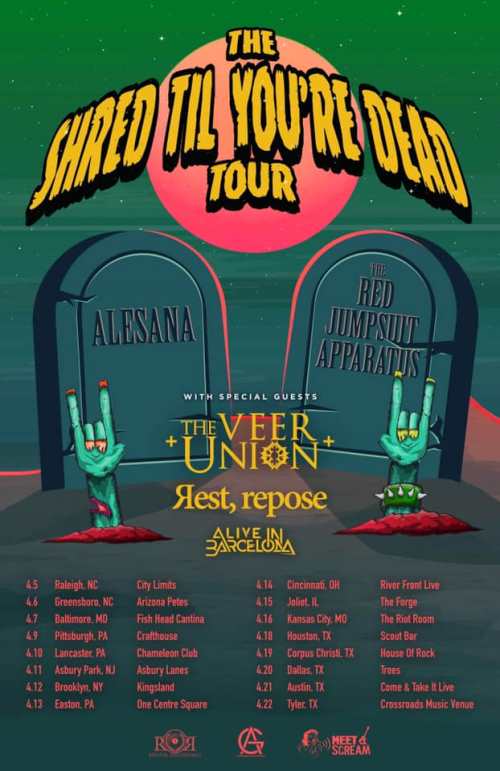 Alesana, Red Jumpsuit Apparatus, The Veer Union, Rest, Repose, and Alive In Barcelona have announced a tour of the U.S. dubbed The Shred Til You’re Dead Tour. Alesana and Red Jumpsuit Apparatus will be co-headlining the spring trek. Tickets are on sale now.