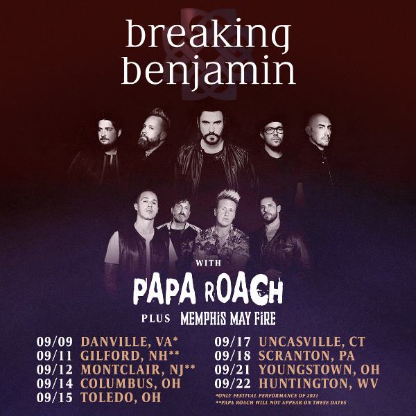 Breaking Benjamin, Papa Roach, and Memphis May Fire will hit the road together for a string of September shows that begin with an appearance at the Blue Ridge Rock Festival. Members of Breaking Benjamin’s fan club can get tickets now at FanclubBreakingBenjamin.com. General sale begins this Friday, August 6th at 10:00 AM local time. Visit BreakingBenjamin.com for additional information.