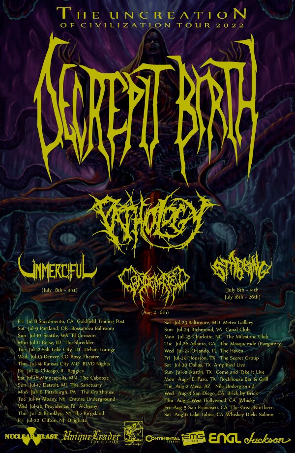 Decrepit Birth will be on a headlining trek this summer with Pathology dubbed The Uncreation of Civilization Tour. Select stops of the run will also feature Unmerciful, Condemned, and Stabbing. Tickets are available now.
