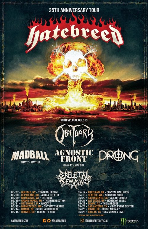 Hatebreed will continue to celebrate their 25th anniversary with a new batch of U.S. shows. Obituary will also provide direct support on this new leg. Madball and Agnostic Front will appear on select dates, with Prong and Skeletal Remains rounding out the bill. Tickets go on sale this Friday, February 15th at Hatebreed.com. Prior to this run, Hatebreed will be out with Obituary, Cro-Mags, Terror, and Fit For An Autopsy. Get those dates here.