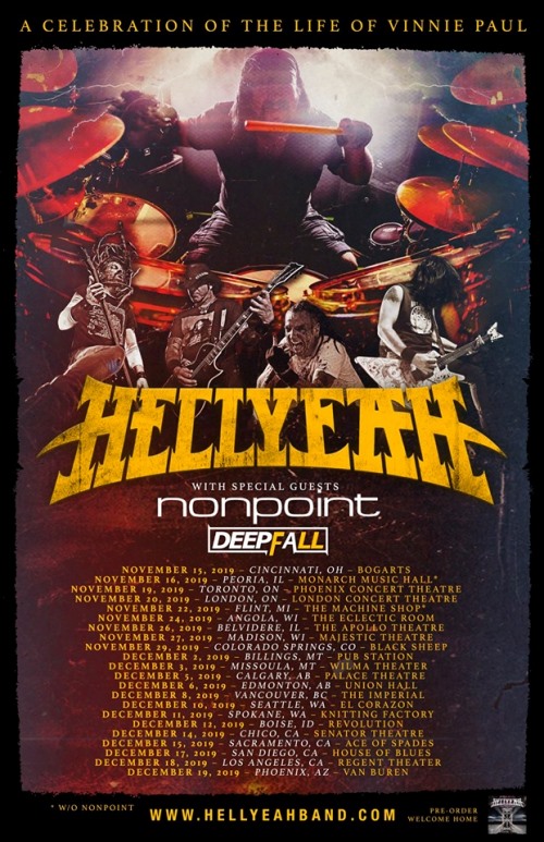 HELLYEAH will embark on a headlining North American tour in November to support their upcoming full-length Welcome Home (Eleven Seven). Joining them on the run will be Nonpoint and Deepfall. The trek continues their A Celebration of the Life of Vinnie Paul tour, with a portion of tickets sales being donated to the American Heart Association in memory of the group’s late drummer Vinnie Paul.