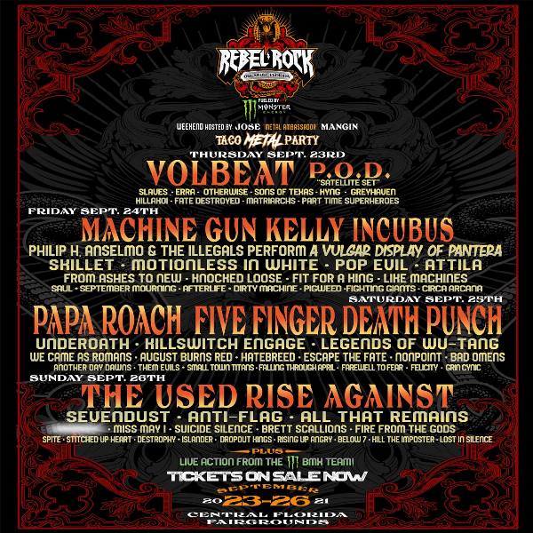 Rebel Rock Fest is slated to take place from Thursday, September 23rd to Sunday, September 26th in Orlando, FL at the Central Florida Fairgrounds. Tickets and additional information can be found at RebelRockFest.com. Get the updated daily lineup list below: