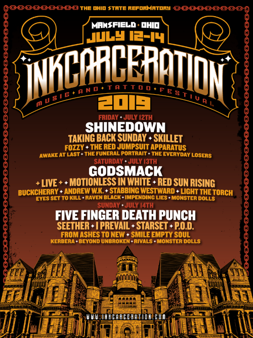 The daily lineups and set times for this year’s Inkcarceration Festival are now available and can be found below. The event is scheduled to once again take place at the historic Ohio State Reformatory – the site of the film Shawshank Redemption – in Mansfield, OH from Friday, July 12th to Sunday, July 14.