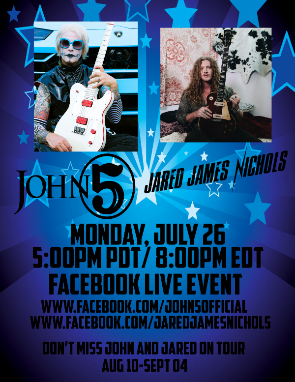 John 5 and Jared James Nichols will be hosting a Facebook Live event together ahead of their upcoming U.S. tour together. The livestream is scheduled for Monday, July 26th at 5:00 PM PDT/8:00 PM EDT and will feature the two trading guitar licks and sharing stories about music, guitars, and life in general. You can submit questions in advance via their Facebook pages here (John 5) and here (Jared James Nichols)