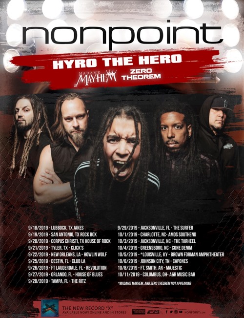 Nonpoint have announced a fall headlining U.S. tour with support provided by Hyro The Hero, Madame Mayhem, and Zero Theorem. Tickets are on sale now. Three additional shows are pending.