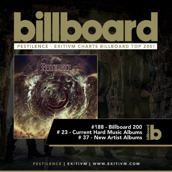 Death dealers Pestilence’s ninth studio album, Exitivm has landed on several Billboard charts following its release, including the top 200. The effort, entered the Billboard 200 at #188, Current Hard Music Albums at #23, and New Artist Albums at #37 in its first week out. Exitivm hit stores on June 25th through Agonia Records. You can purchase the album now at Exitivm.com or Bandcamp. Listen to the effort in its entirety here.