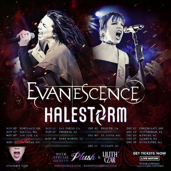 Plush and Lilith Czar have been confirmed as support on Evanescence and Halestorm’s upcoming U.S. tour. Plush will open on the November dates, while Lilith Czar will open on the December shows. Tickets are on sale now. Confirmed dates for the tour follow: