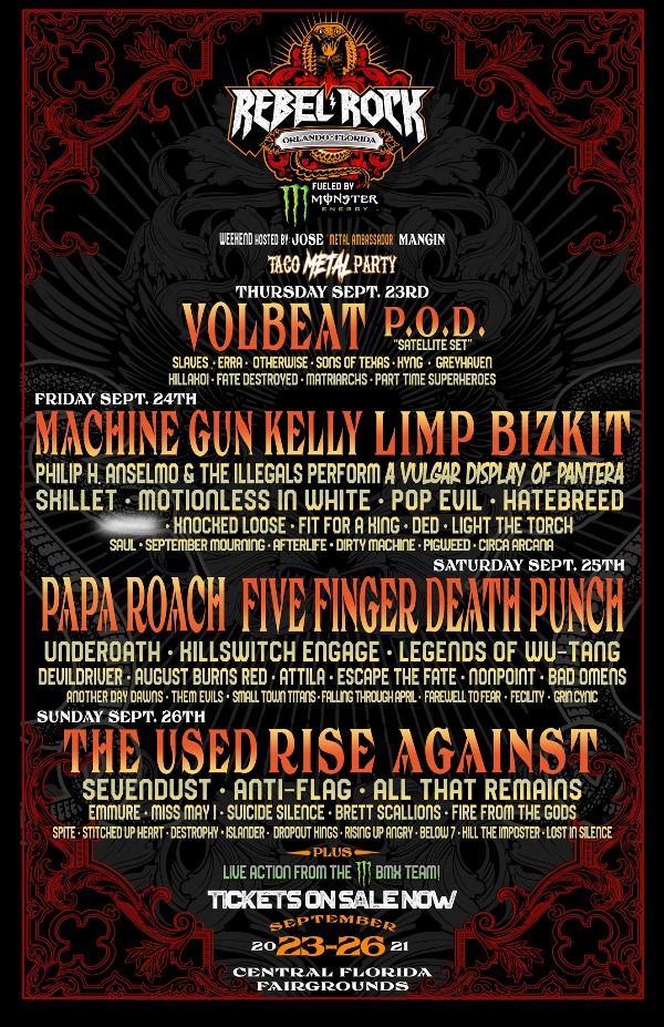 The event will be held at the Central Florida Fairgrounds in Orlando, FL beginning on Thursday, September 23rd; concluding on Sunday, September 26th. Additional tickets and information can be found at RebelRockFest.com. Jose Mangin of Sirius XM fame will host the event througout the weekend. The lineup is as follows: