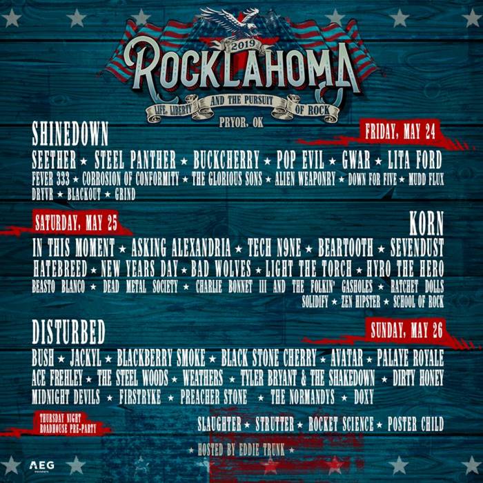 The daily set times for this year’s Rocklahoma festival are now available. The event is scheduled to begin next Thursday, May 23rd with a pre-party, running through Sunday, May 26th. It will be held at Pryor Creek Music Festival Grounds in Pryor, OK. Tickets and additional information can be found at Rocklahoma.com.