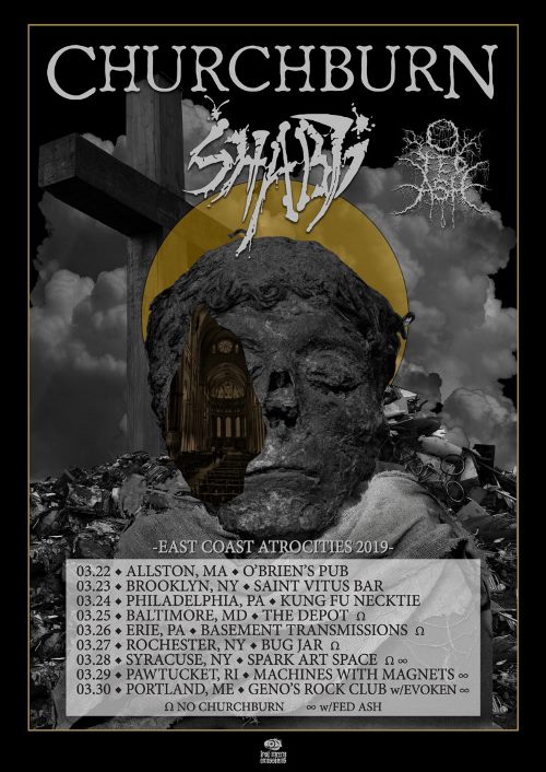 Shabti will be on tour beginning March 22nd, partially with Providence death/doom outfit Churchburn as well as Syracuse-based noisecore act Fed Ash, with Scaphism, Unearthly Trance, Sunken Cheek, Haxen, and others also playing on select dates. The tour ends March 30th with a hometown show in Portland with funeral doom lords Evoken, Churchburn, and Fed Ash. The tour admat was designed by Ethan McCarthy of Primitive Man/Cool Ghoul/Many Blessings.