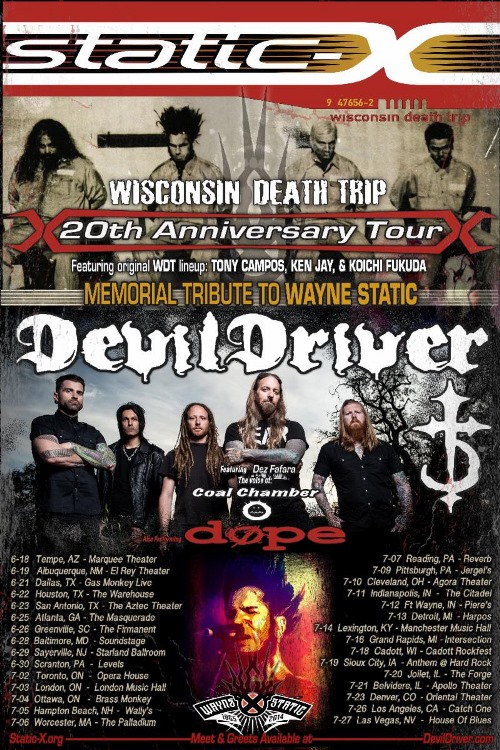 Dates for Static-X’s North American tour celebrating the 20th anniversary of the group’s debut record Wisconsin Death Trip and the memory of late frontman Wayne Static are now available. The tour will feature the original lineup on the album: Tony Campos on bass, Ken Jay on drums, and Koichi Fukuda on guitar. A fill-in vocalist for the trek has yet to be revealed. DevilDriver will be co-headlining the tour, performing a full set each night as well. Dope will be providing support along with other acts, which will be announced at a later date.