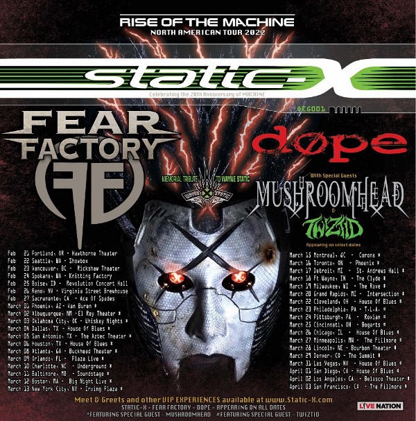 Static-X have announced a 2022 North American tour celebrating the 20th anniversary of their 2001, sophomore full-length, Machine. The trek, dubbed The Rise of the Machine Tour, will include Fear Factory and Dope, with select dates featuring Mushroomhead and Twiztid. Static-X said of the tour