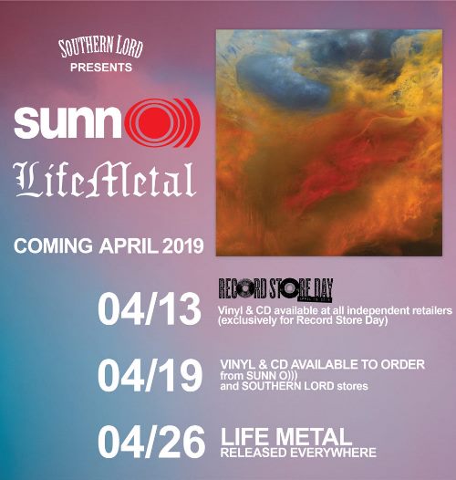 Sunn O))) is pleased to collaborate with Record Store Day (#RSD19) to release Life Metal for the first time on CD and vinyl on April 13th via USA/UK/EU indie retail. April 26th marks the official release date of the CD, digital and all other vinyl via Southern Lord, and CD and LP will be available to order from Sunn O))) and Southern Lord stores on April 19th.