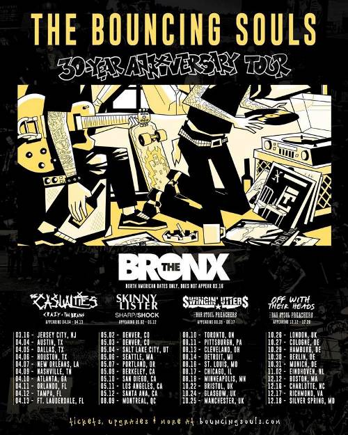 The Bouncing Souls will be celebrating their 30th anniversary with a series of tours throughout the year. Direct support on the trek will be provided by The Bronx. Select dates will feature The Casualties, Crazy & The Brain, Skinny Lister, Sharp/Shock, Swingin’ Utters, The Bar Stool Preachers, and Off With Their Heads. Tickets go on sale this Friday, January 25th at 10:00 AM.