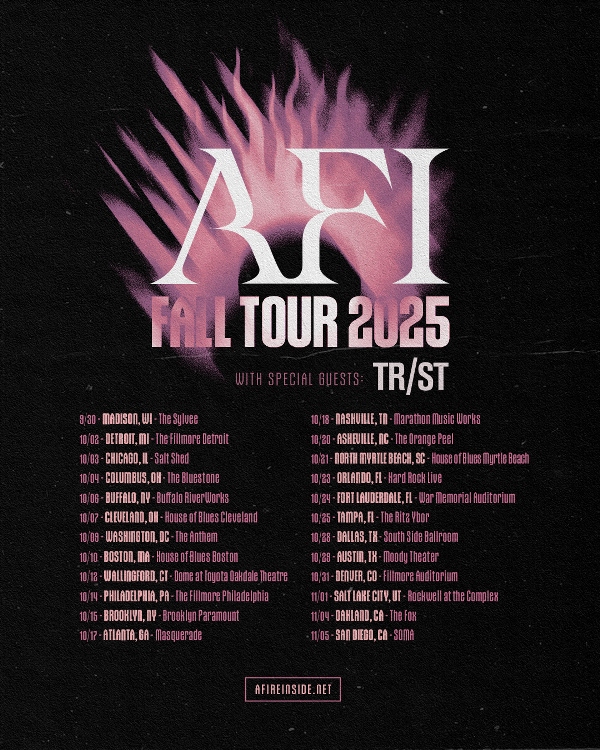 AFI will hit the road this fall on a headlining tour of the U.S. with support provided by TR/ST. Artist pre-sales begin tomorrow, Wednesday, June 25th at 10:00 Am local time. Additional pre-sales will follow and general sale starts Friday, June 27th at 10:00 AM local time.
