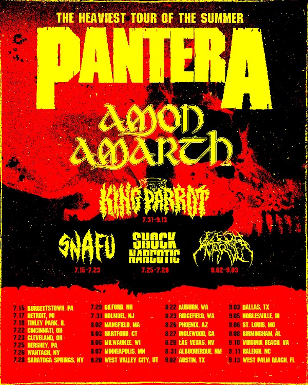 Amon Amarth hit the road yesterday on a North American tour supporting Pantera. Snafu, Shock Narcotic, and King Parrot open on select dates. The remaining itinerary for the tour can be found below. Tickets are available via AmonAmarth.com/tour.