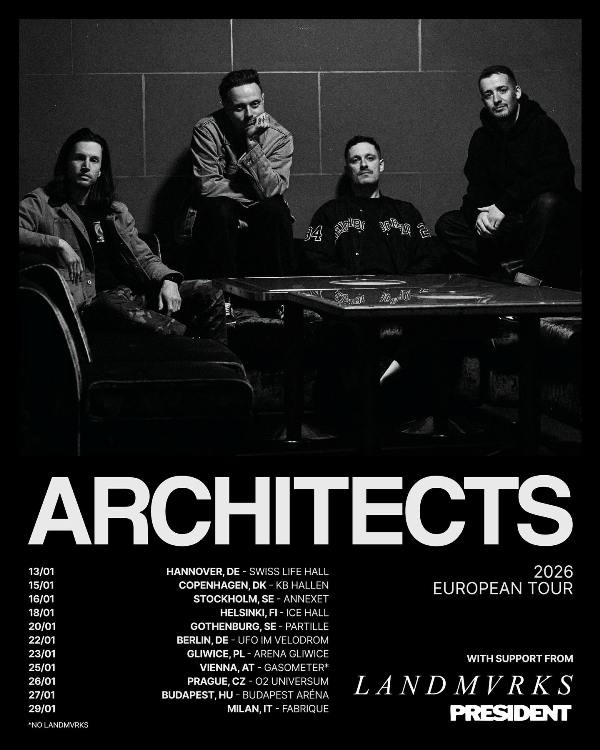 Architects have announced an early 2026 headlining tour of Europe. The January run will feature LANDMVRKS and President providing support. Tickets go on sale this Wednesday, July 2nd at 10:00 AM local time.