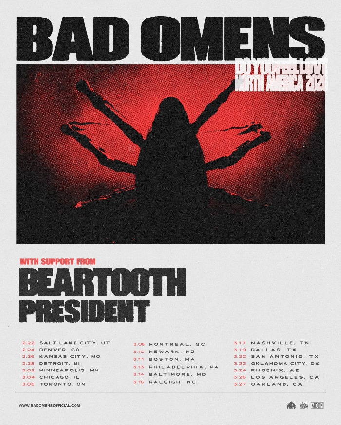 Bad Omens have announced a 2026 headlining North American tour. Supporting them on the Do You Feel Love Tour will be Beartooth and PRESIDENT. Pre-sale tickets are available now with the code DYFL. General sale is slated for Friday, October 31st at 10:00 AM local time.