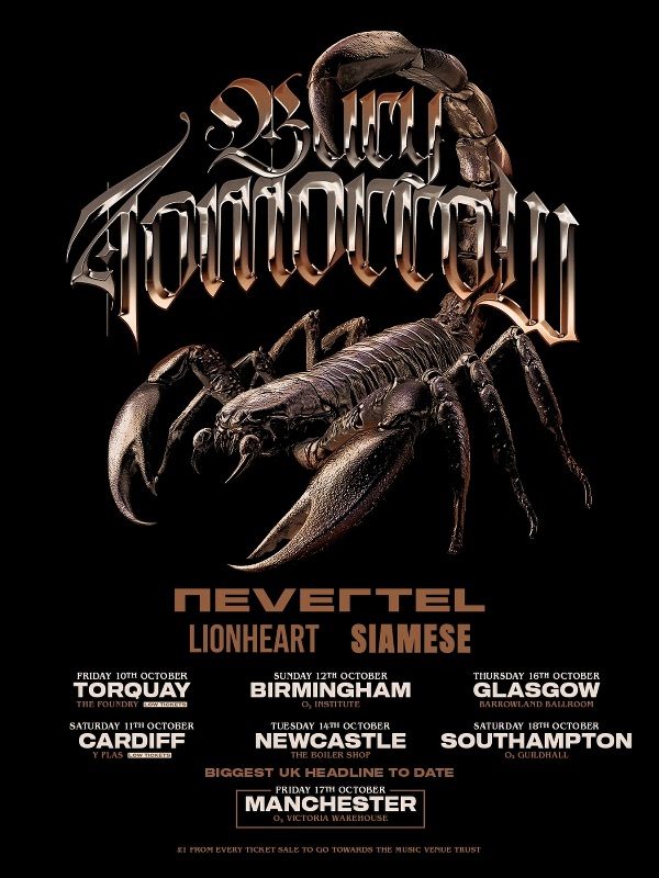 British metalcore outfit Bury Tomorrow have revealed that Nevertel, Lionheart, and Siamese will be joining them on their upcoming headlining tour. A portion of all proceeds from the trek will go towards Music Venue Trust, a charity “which acts to protect, secure and improve UK Grassroots Music Venues for the benefit of venues, communities and upcoming artists”. Get tickets now via Bury-Tomorrow.com.