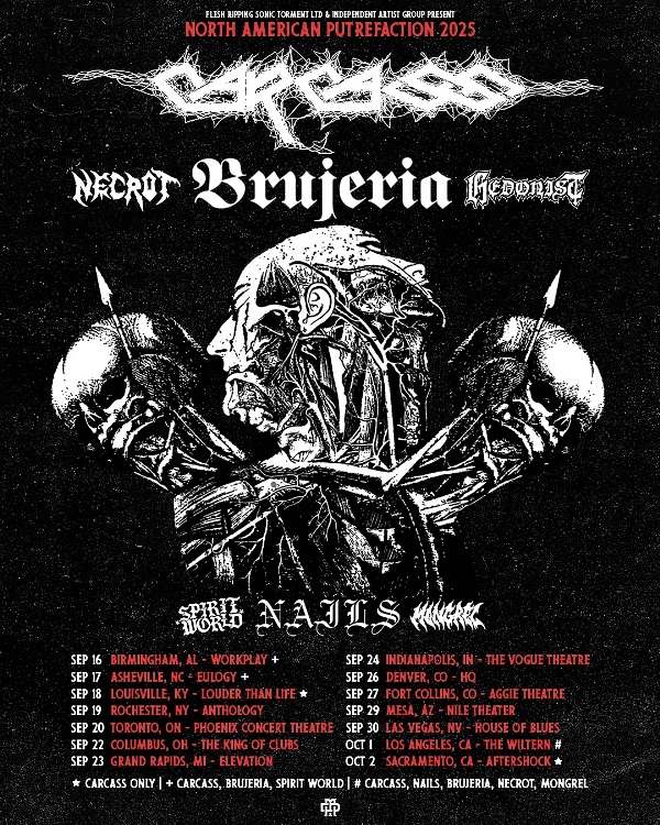 Legendary grind outfit Carcass have announced a fall tour of North America. Support throughout a majority of the run will be provided by Brujeria and Necrot. SpiritWorld, Hedonist, Nails, and Mongrel will appear in a more limited capacity. See the itinerary below for exact lineups. Tickets go on sale this Thursday, July 10th.