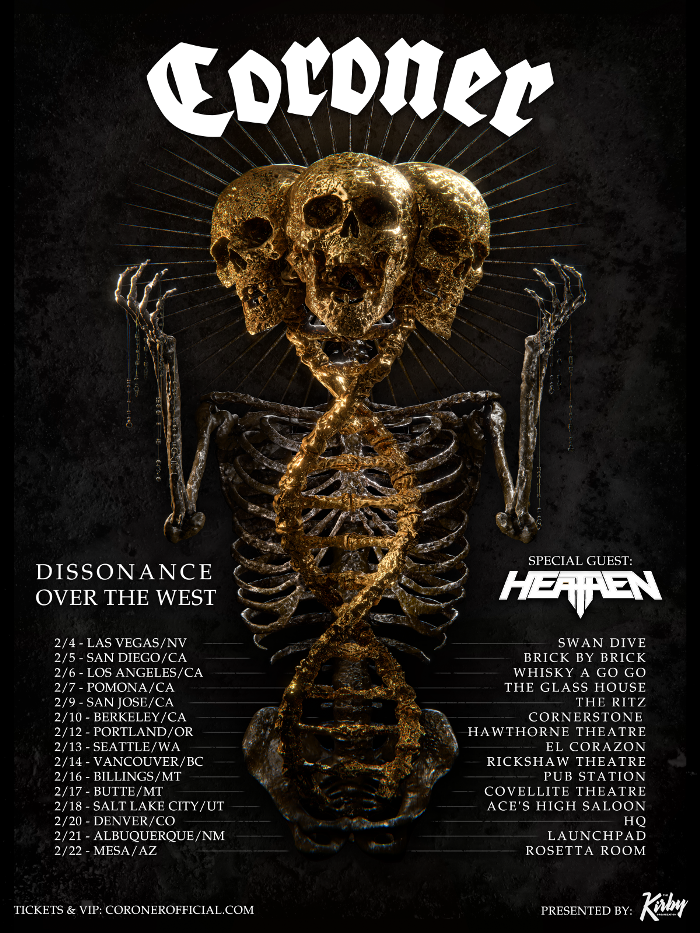 Tech-thrashers Coroner have announced a headlining tour of North America in support of their latest album Dissonance Theory. Joining the Swiss trio on the Dissonance Over The West Tour will be California thrashers Heathen. Tickets are on sale now and can be purchased here.
