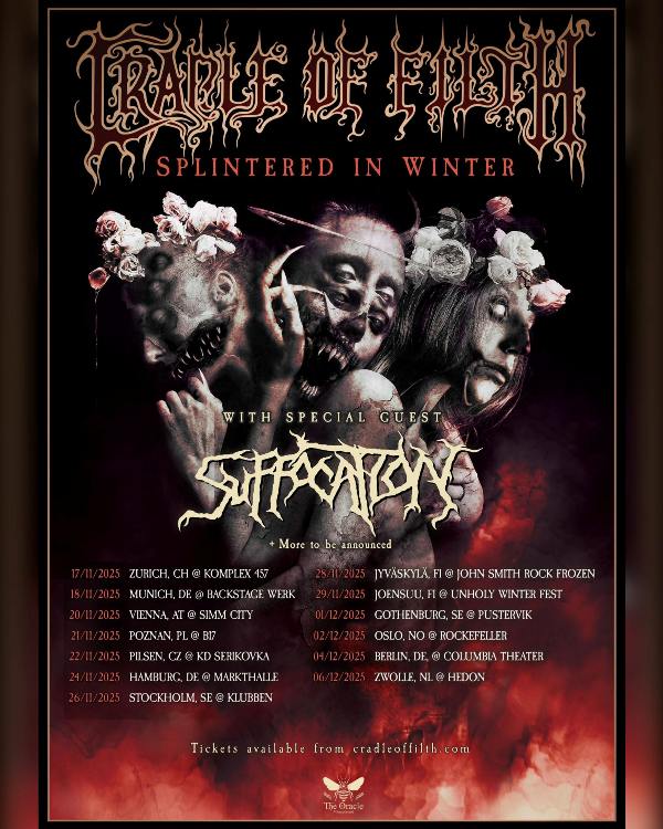 Cradle of Filth and Suffocation have announced that they will be touring Europe together this fall. Additional support on the trek, dubbed the Splintered in Winter Tour. Tickets will be available this Friday, August 1st beginning at 11:00 AM CEST at cradleoffilth.com.