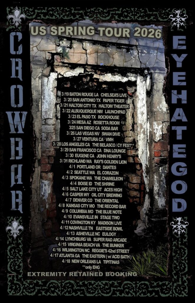 Crowbar and Eyehategod have announced that they will tour the U.S. this spring. The sludge pair will be hitting the following venues: