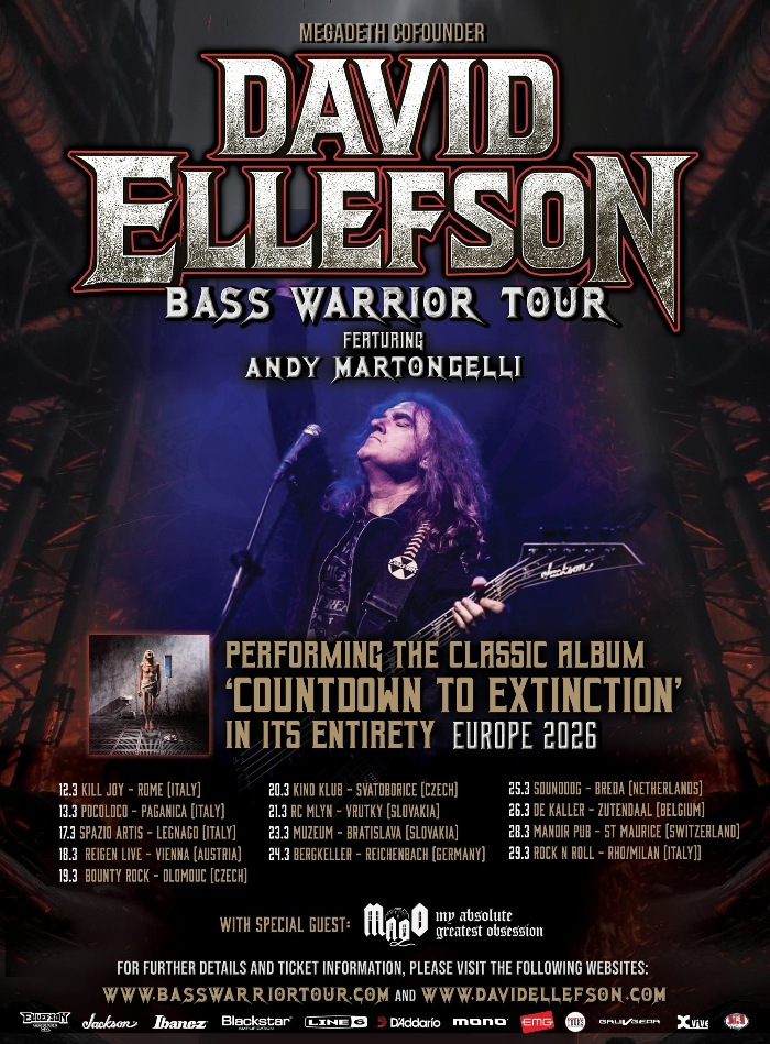 GRAMMY Award winning bassist David Ellefson has announced his Bass Warrior Tour in Europe for March 2026. The tour will feature Ellefson and his solo band performing select cuts from his well-known catalog of Mega hits, including the Megadeth Countdown to Extinction album in it’s entirety, solo material and other hard rock & metal favorites which inspired him during his 40-year music career. Direct support on all dates is Mado.