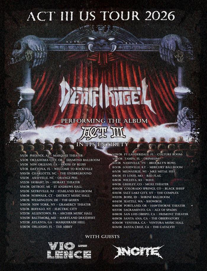 So, because of the overwhelming demand, we’re damn proud to announce the 2nd leg of the Death Angel Act III U.S. Tour with support from Bay Area brethren Vio-Lence and Incite from Phoenix! Again we’ll be performing Act III in FULL, plus select songs from across our catalog.