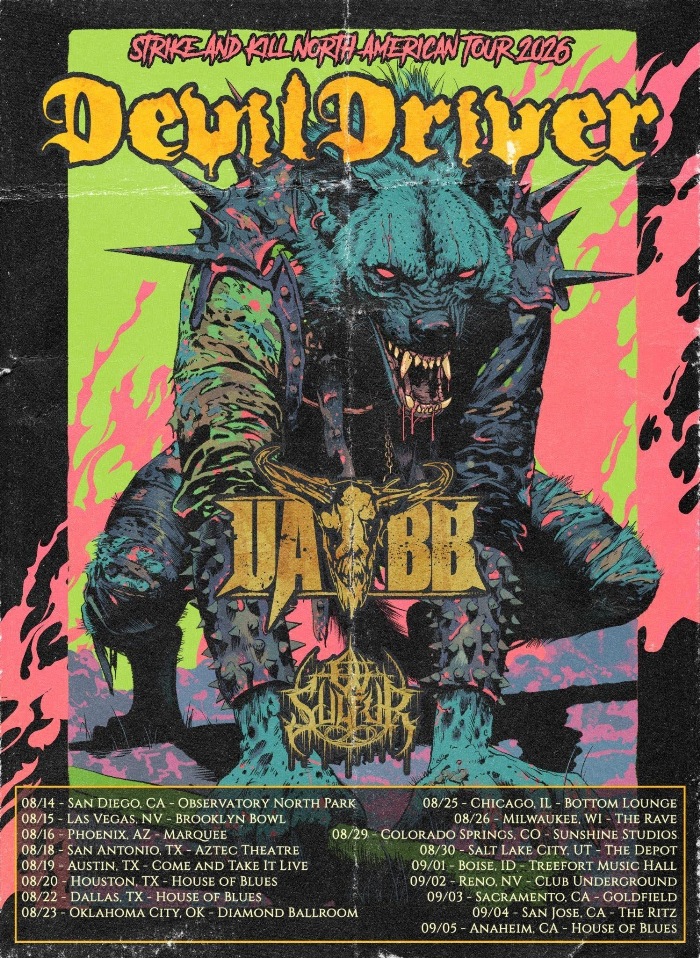 Additionally, DevilDriver will be touring across the western United States with Upon A Burning Body and Ov Sulfur. Kicking off August 14 in San Diego, CA, the Strike and Kill North American Tour 2026 will hit a slough of major cities including Dallas, TX, Chicago, IL, Salt Lake City, UT, and Reno, NV before its thunderous conclusion on September 5 in sunny Anaheim, CA. Artist presale is live NOW, see below for a complete list of dates and the artist presale code