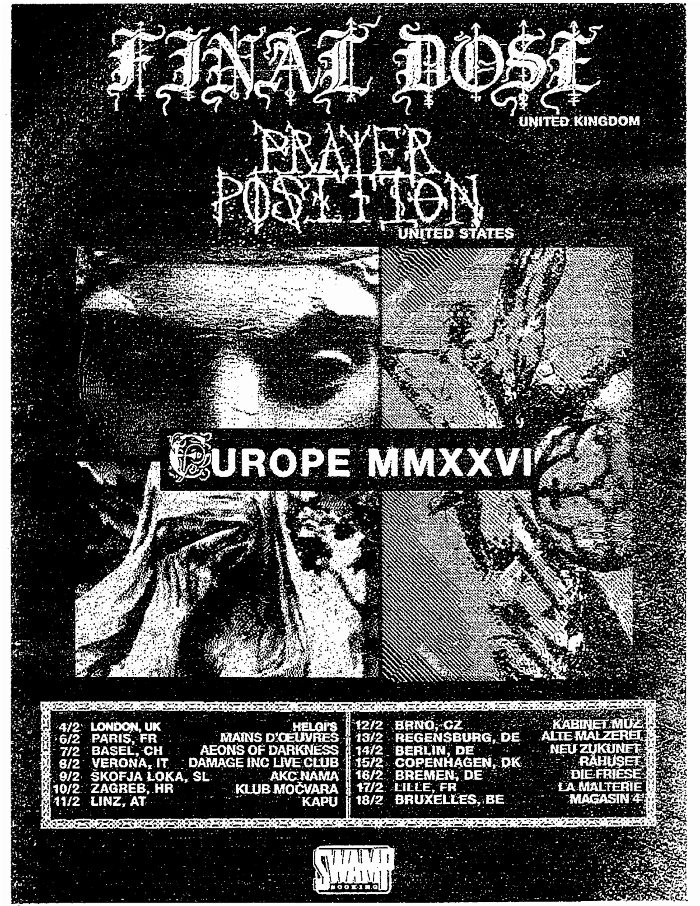 Final Dose will embark on a headlining tour of Europe this spring with support provided by Prayer Position. The trek begins with a performance in London before taking over mainland Europe. Dates can be found below.
