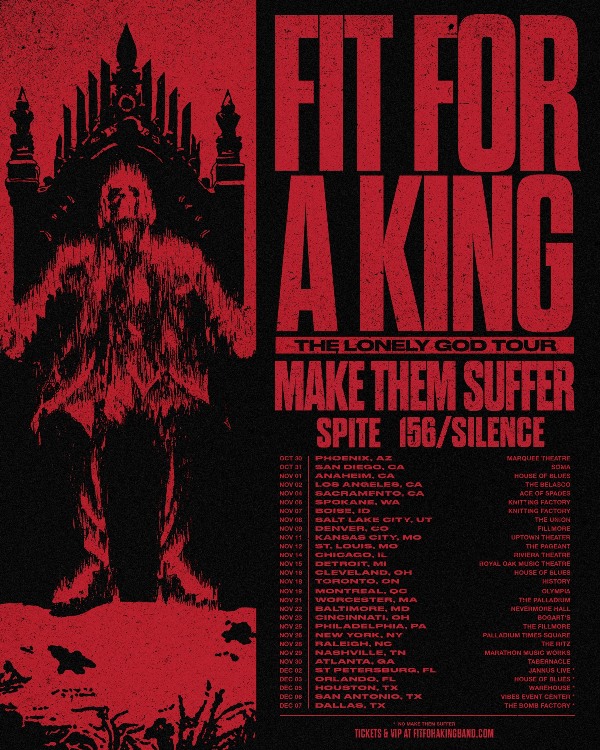 Texas metalcore unit Fit For A King have announced a headlining North American tour in support of their forthcoming studio album The Lonely God (Solid State). Supporting them will be Make Them Suffer, Spite, and 156/Silence. VIP & pre-sale tickets are available now via Soundrink. General sale kicks off this Friday, June 20th at 10:00 AM local time.