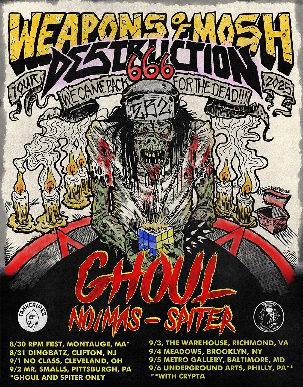 Ghouls have announced a batch of East Coast tour dates. Dubbed the Weapons of Mosh Destruction 666 Tour, the trek kicks off at the end of August and features support by No/Más and Spiter. Bandleader Digestor comments: