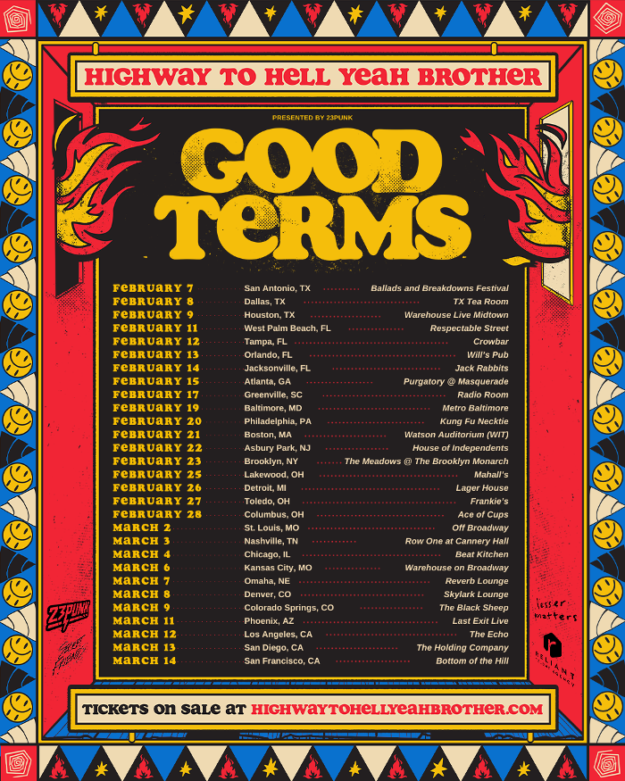 Good Terms will be on the road this spring for their headlining Highway To Hell Yeah Brother Tour, presented by 23Punk. The tour kicks off on February 7th in San Antonio, with stops to follow in Orlando, Atlanta, Boston, Brooklyn, Nashville, Chicago, Los Angeles, and more. For more information or to purchase tickets, please visit: www.goodtermsband.com.