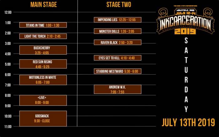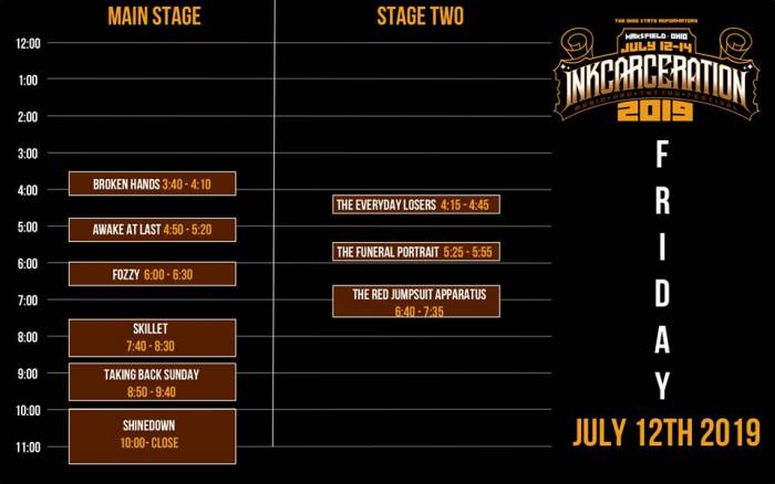 The daily lineups and set times for this year’s Inkcarceration Festival are now available and can be found below. The event is scheduled to once again take place at the historic Ohio State Reformatory – the site of the film Shawshank Redemption – in Mansfield, OH from Friday, July 12th to Sunday, July 14.
