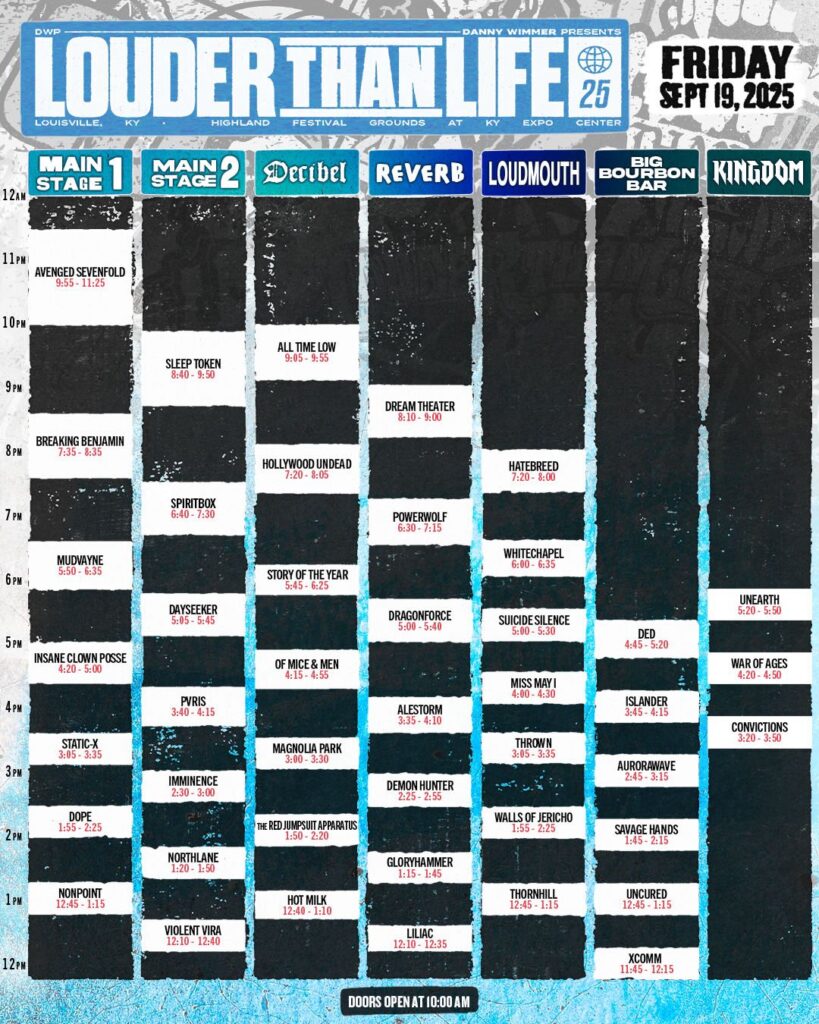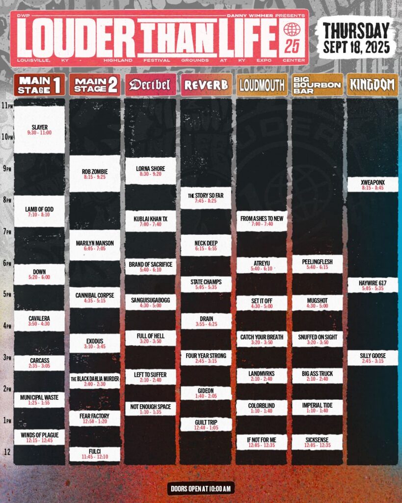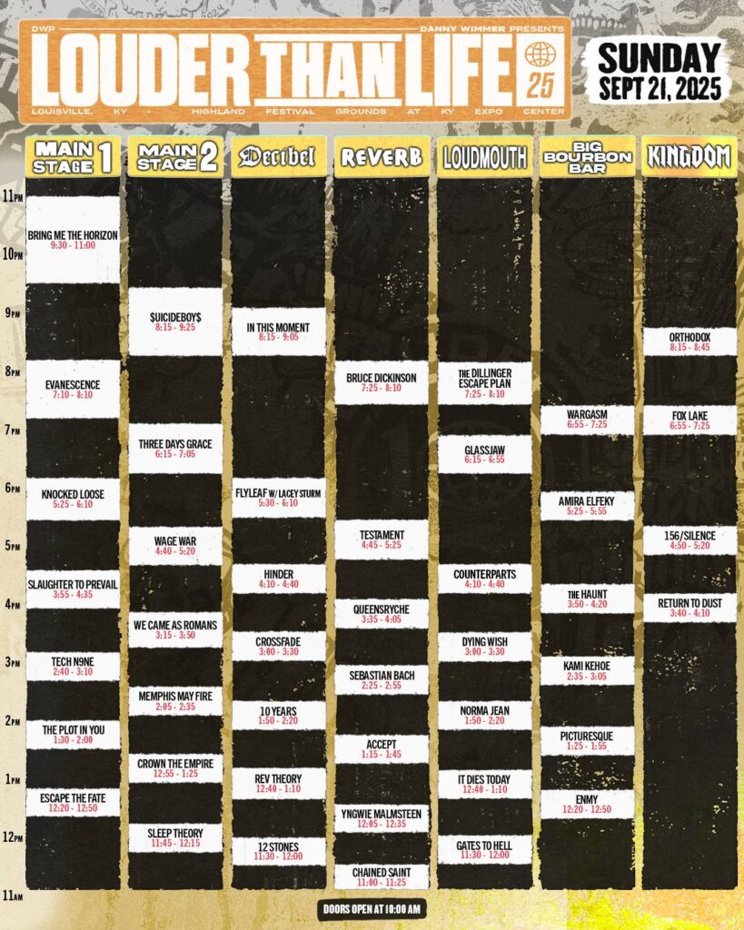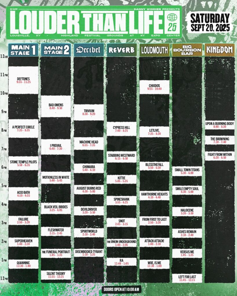 Louder Than Life have revealed the daily set times for this year’s edition of the annual festival. You can find those below along with a map of the grounds so you can play your weekend if you’re attending. As is customary, the even will take place in Louisville, KY at the Highland Festival Grounds. The festivals kicks off on Thursday, September 18th and wraps up on Sunday, September 21st. Head over to LouderThanLifeFestival.com for tickets and additional details.