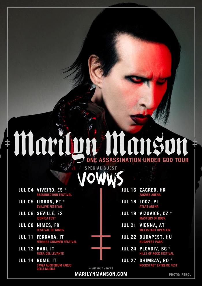 Marilyn Manson has announced dates for a summer tour of Europe. Support on the run, which includes stops at a number of festivals, will be provided by VOWWS. Tickets are on sale now via MarilynManson.com.