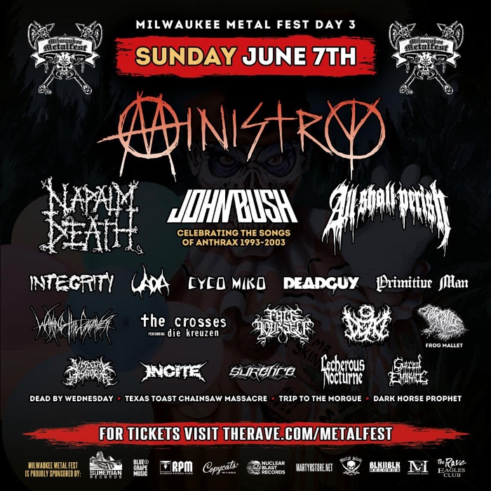 The complete Milwaukee Metal Fest lineup for Sunday, June 7 is in! Please welcome Napalm Death, Primitive Man and Face Yourself. They bands join Ministry, John Bush performing his Anthrax era, All Shall Perish (Celebrating 20 years of The Price of Existence), Integrity, UADA, Deadguy, Waking The Cadaver and many more!