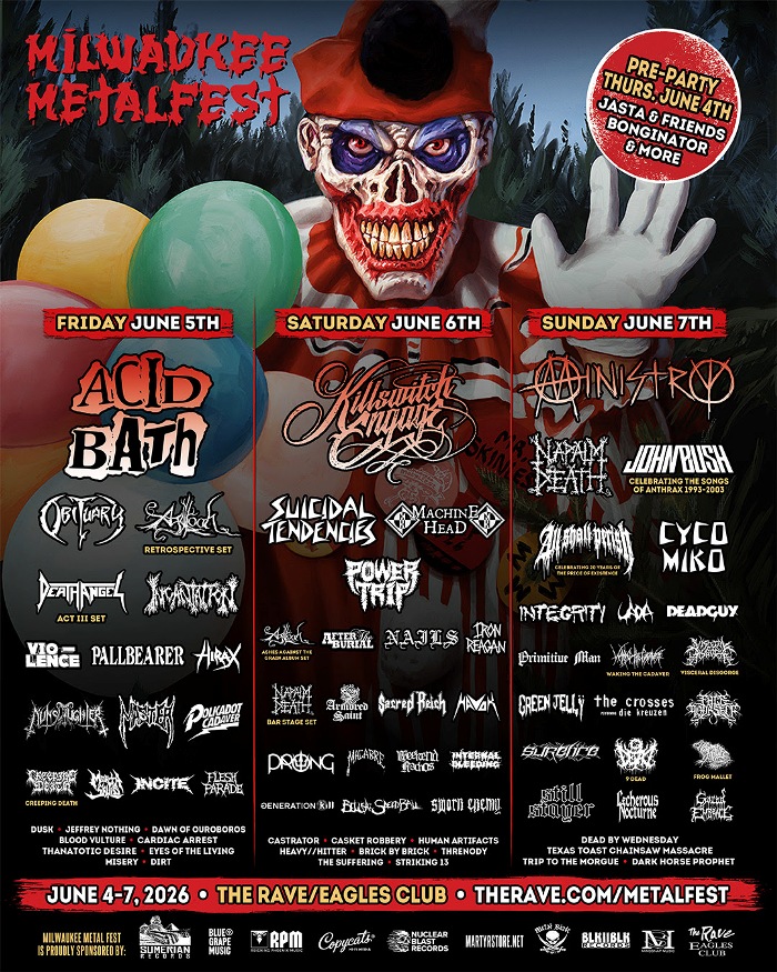 Fans can get access to the Thursday pre-party on June 4 for FREE with the purchase of a 3-day festival pass to Milwaukee Metal Festival. Come see Acid Bath, Killswitch Engage, Ministry, Obituary, Agalloch + many more for the BEST WEEKEND EVER!