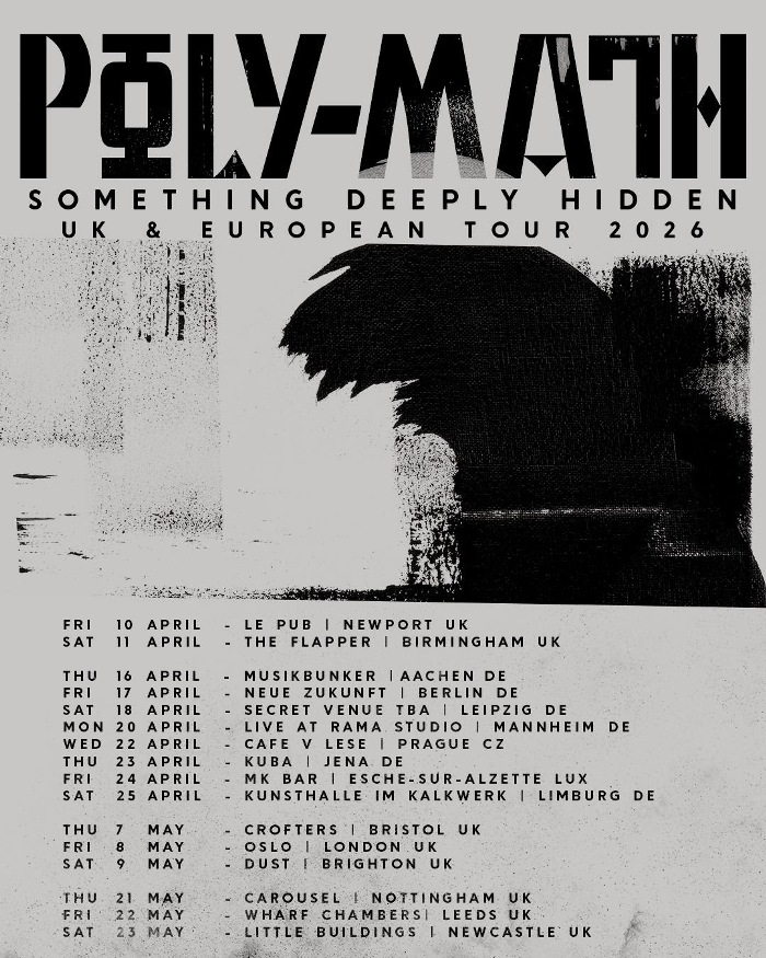 Poly-Math will support Something Deeply Hidden with tour dates scattered across the UK and Europe beginning the day of the album’s release, April 10th, running through May 23rd. All current dates are listed below, and additional live excursions are to be expected. During the tour, Poly-Math will also include additional percussionist, Sam Simpson of Memory of Elephants, to better portray the tracks on the new album.
