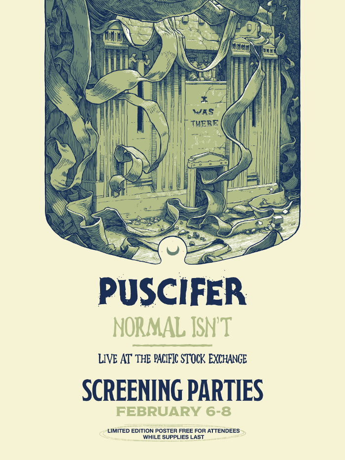 The Pusciverse – As the countdown to the Feb. 6 release of Puscifer’s fifth studio album, Normal Isn’t, continues, the band is inviting fans to celebrate at select independent record stores with early screenings of their new concert film, Normal Isn’t: Puscifer Live at the Pacific Stock Exchange. Maynard James Keenan notes: