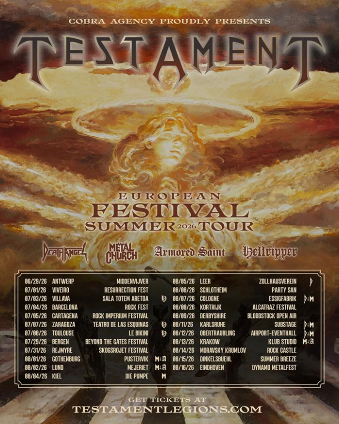 Testament will be filling the gaps of their planned festival appearances overseas with several headlining performances. Support will vary at these shows with Death Angel, Metal Church, Armored Saint, and Hellripper joining them on select dates. Tickets go on sale Monday, February 2nd at 10:00 AM CET via TestamentLegions.com.