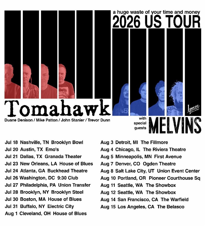 Featuring Duane Denison, Mike Patton, John Stanier, and Trevor Dunn, Tomahawk last toured in support of 2013’s Oddfellows before returning in 2021 with Tonic Immobility, which was released during the pandemic and never performed live.