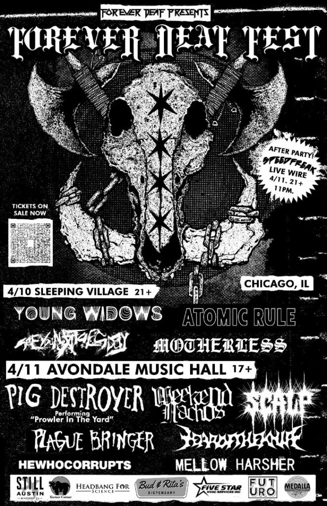 Forever Deaf Fest will take place at Sleeping Village and Avondale Music Hall with a special after show party at Live Wire Lounge. In addition to Young Widows, the epic weekend will include sets by Atomic Rule (featuring members of Every Time I Die, Dry Kill Logic, Acacia Strain, and Eternal Sleep), SeeYouNextTuesday, Motherless (featuring members of The Atlas Moth and Without Waves), Weekend Nachos performing their only Chicago area show of 2026, Scalp, Year Of The Knife, Plague Bringer (their first show in a decade), HeWhoCorrupts, Mellow Harsher, and day two headliners Pig Destroyer blazing through their monumental Prowler In The Yard full-length in its ravaging entirety (a 25-year album anniversary celebration and their only Midwest show).